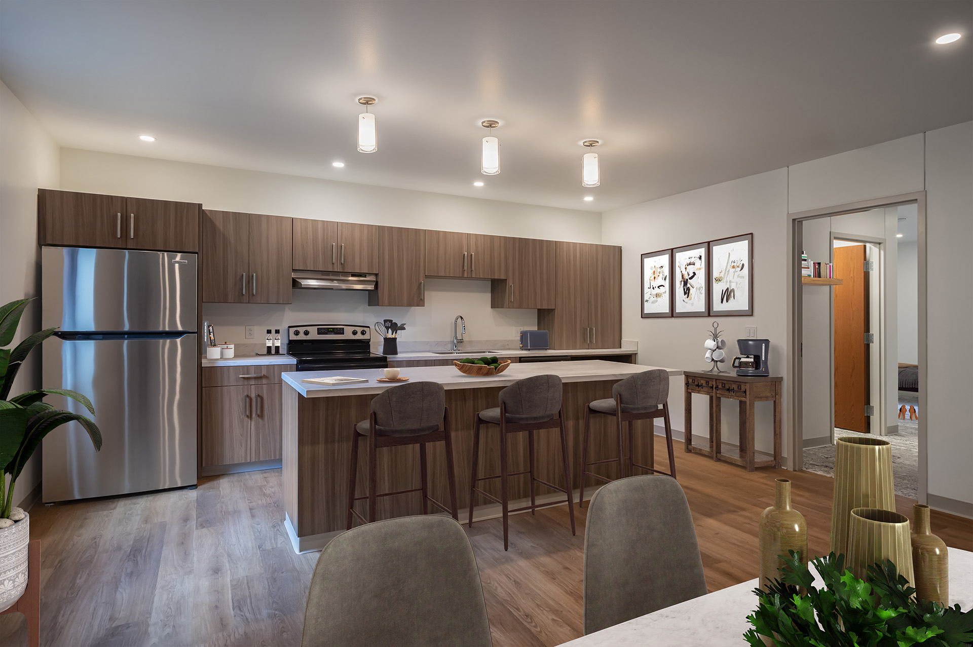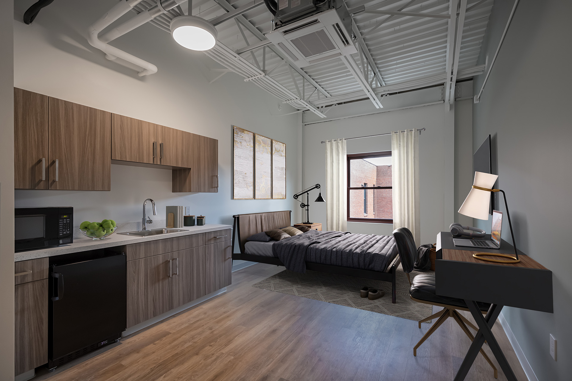 The third floor is dedicated to the mission students. There are several apartments on this floor ranging from studio-style to two-bedroom apartments. The apartments have a kitchenette and dedicated restroom. The renovated space also includes a large communal kitchen and dining space, shared activity space and shared laundry.