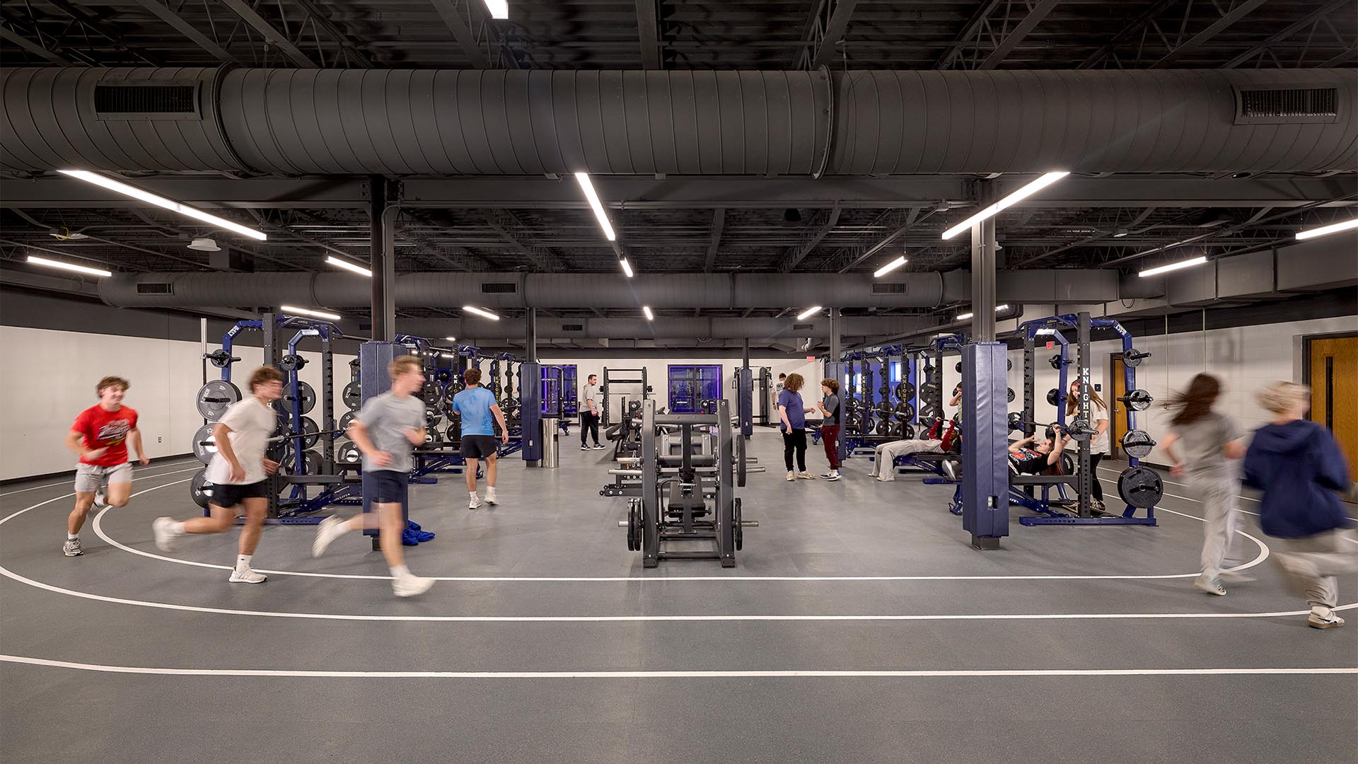 As construction progressed, DRAW repurposed the former cafeteria into a new Wellness Center. This space supports physical education classes, the athletics department, and community use after school hours. It includes weights, treadmills, fitness equipment, a small track, and a centrally located private group fitness area.