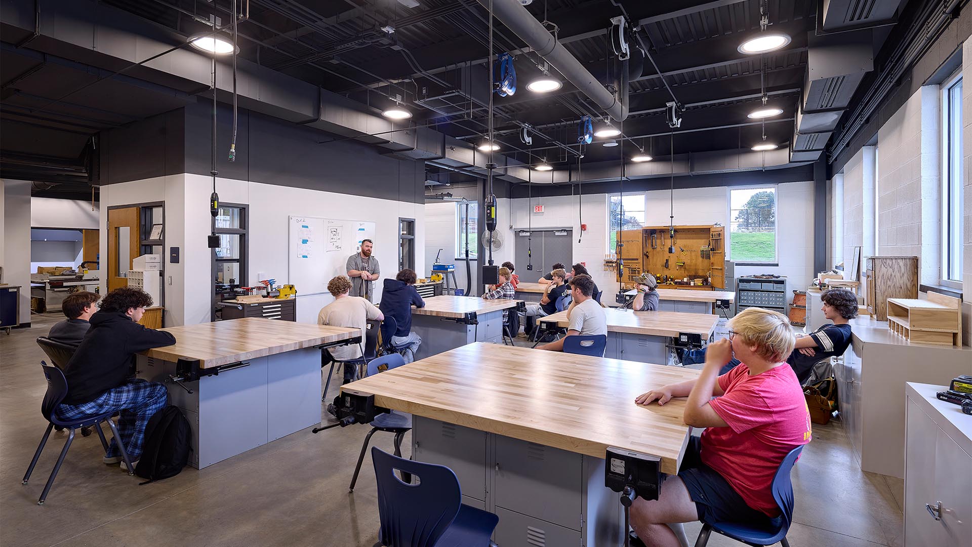 DRAW designed the expansion and renovation of Knoch School District High School to feature a bright, distinct new entrance. As part of the addition, the team created a large, multipurpose student commons with collaborative learning areas and cafeteria seating after relocating the original cafeteria. In addition, DRAW added new technology education classrooms equipped with proper ventilation, high-tech machinery, 3D printers, and robotics equipment to support hands-on learning.