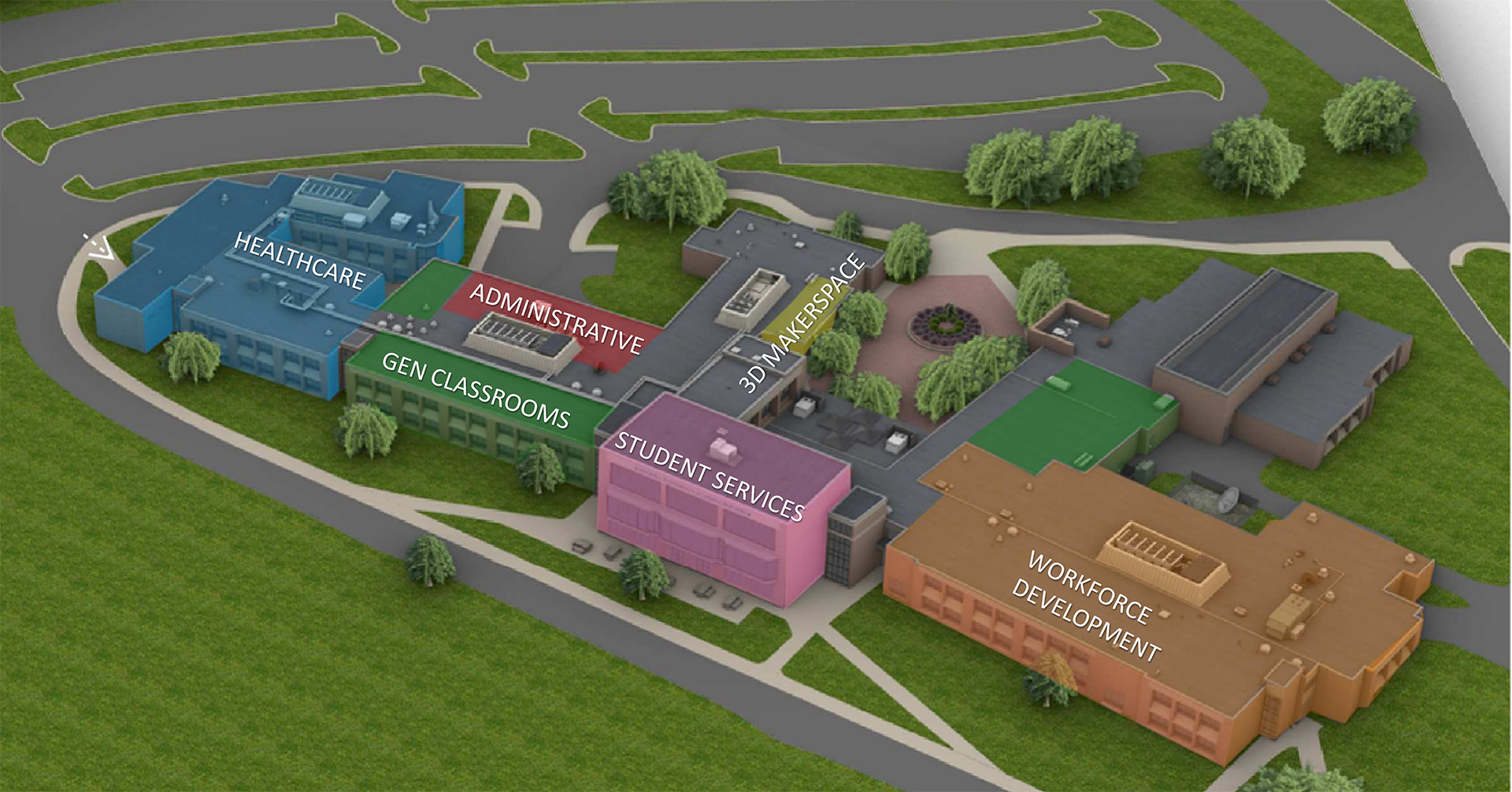 The master plan for the college attempted to address the declining number of in-person students in two ways: by creating more inviting places for students to “hang out” while on campus, and by enhancing spaces for the more “hands-on” programs such as nursing, emergency medicine, and welding.