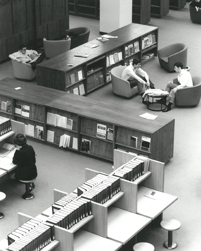 The Hillman Library was designed by our original founders, Kuhn Newcomer and Valentour, and completed in 1968. It was designed with a deep understanding of what students need, how they behave, and what is needed to provide an excellent student environment. Nearly 60 years later, the library remains what is was always intended to be: a supportive learning and collaborative environment. Although it has undergone recent renovations to improve efficiency and maintain a modern aesthetic, key elements of the original design remain intact.
