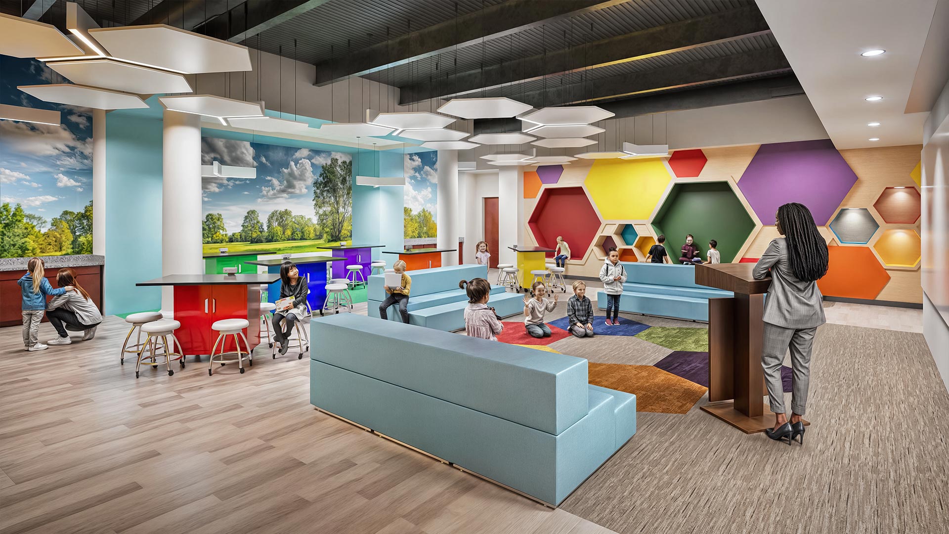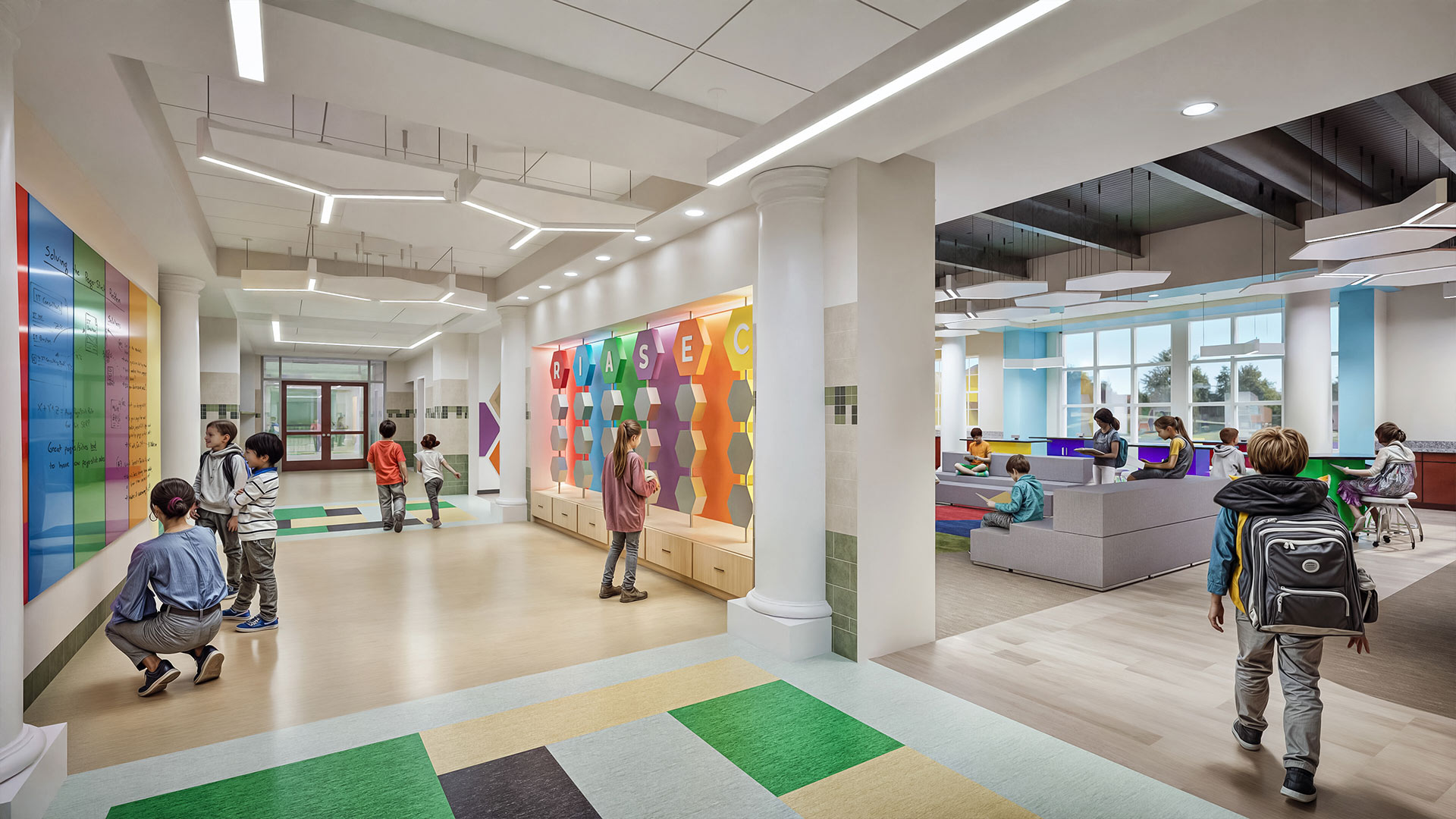 After meeting with South Fayette teachers and staff, DRAW incorporated the World of Work (WoW) program into the renovation plans. The design places WoW spaces across three floors, dedicating each level to a specific grade with age-appropriate activities. Interactive RIASEC stations outside each space welcome students into a colorful, collaborative environment.